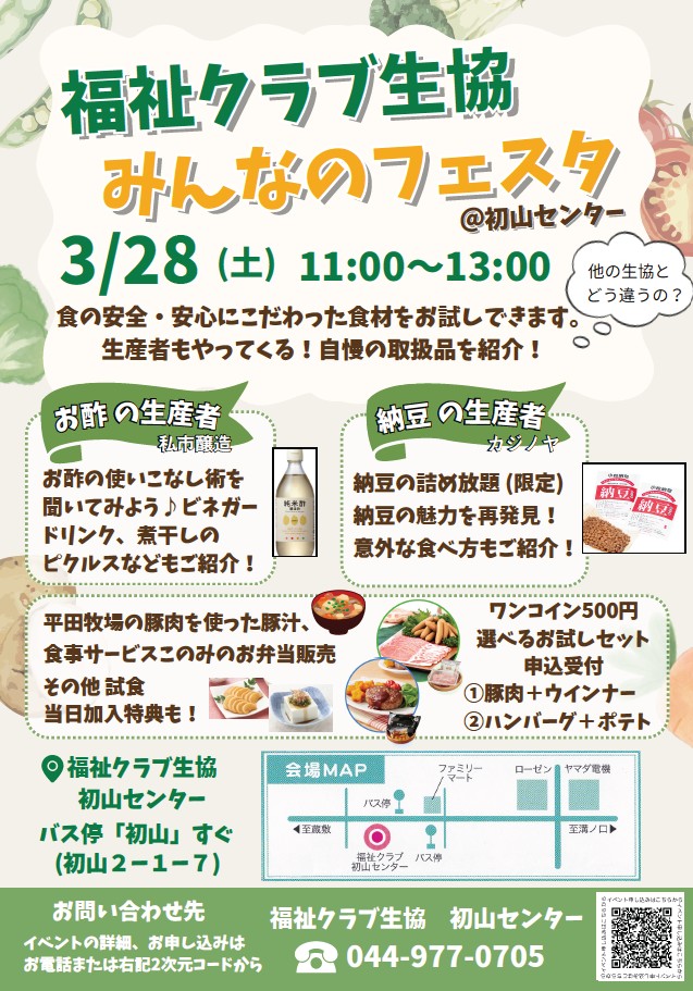 相模原市南区内 3会場・数量限定で、福祉クラブのお勧めしたい食材をご案内します。 お試しから気軽に利用できるので好評です。どうぞお問い合わせください。