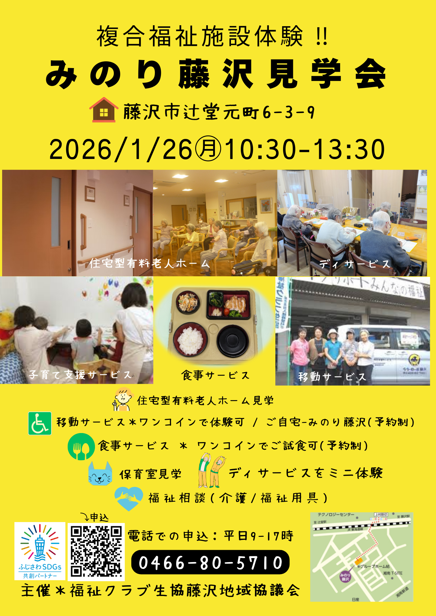 複合福祉施設「みのり藤沢」を体験! 当日は、子育て保育室、デイサービス、入居施設(住宅型有料老人ホーム)の見学とともに、会場までの送迎、食事の試食、福祉相談にも対応します。