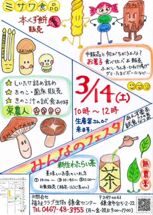 鎌倉市 鎌倉 みんなのフェスタ【2026年3/14】 生産者と一緒に開催するイベント「みんなのフェスタ」。身近な「お茶」「お菓子」そのこだわりのお話を聞いて試飲や試食。へぇ~!納得! 美味しい!を感じに 遊びに来てください。 お問合せ:0467-48-3955 / 福祉クラブ生協 鎌倉センター月~金 9時~17時 参加予約はこちら 前へ 一覧へ戻る 次へ