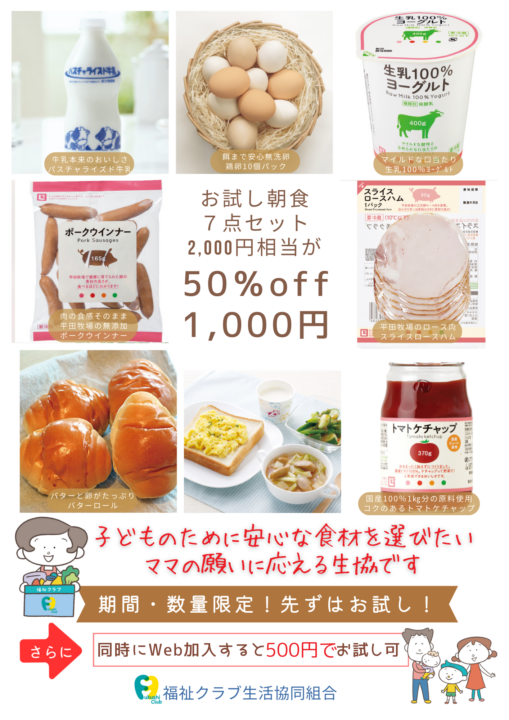 横浜市 港北 お渡し&販売会【2026年2/13】 好評につき、期間・エリア限定で実施中。福祉クラブのこだわりの食材をお試しできる限定セットです。宅配サービスや生協に興味のある方にお知らせください。 ※ 当日のご連絡は、必ずセンターまでお電話お願いします お問合せ:045ー561ー3030 / 福祉クラブ生協日吉センター 月~金 9時~17時 参加予約はこちら 前へ 一覧へ戻る
