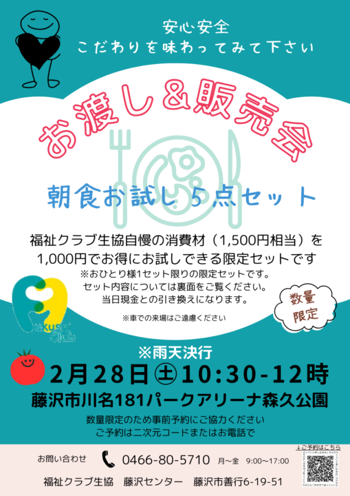 藤沢市 藤沢 お渡し&販売会【2026年2/28】 まだ福祉クラブを知らない方へ、ぜひこだわりの食材を味わってみてください。朝食にちょうどよい限定お試しセットをご用意してお待ちしています。 お問合せ:0466ー80ー5710 / 福祉クラブ生協藤沢センター 月~金 9時~17時 参加予約はこちら 前へ 一覧へ戻る 次へ