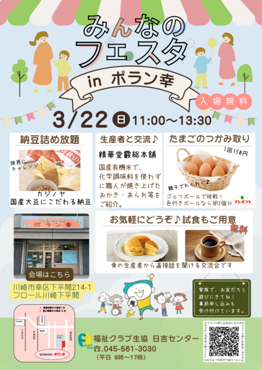 川崎市 ポラン幸 みんなのフェスタ【2026年3/22】 福祉クラブの自慢の生産者と一緒に「みんなのフェスタ」。生産者から直接聞くお話は 、へぇ~!なるほど!試食で納得! お楽しみの詰め放題、つかみ取りも毎回好評です。ご家族で遊びに来てください。 参加予約はこちら 前へ 一覧へ戻る 次へ
