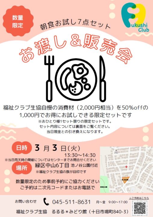 緑区内で、同時間帯3会場・数量限定で、福祉クラブのお勧めしたい食材をご案内します。 お試しから気軽に利用できるので好評です。どうぞお問い合わせください。