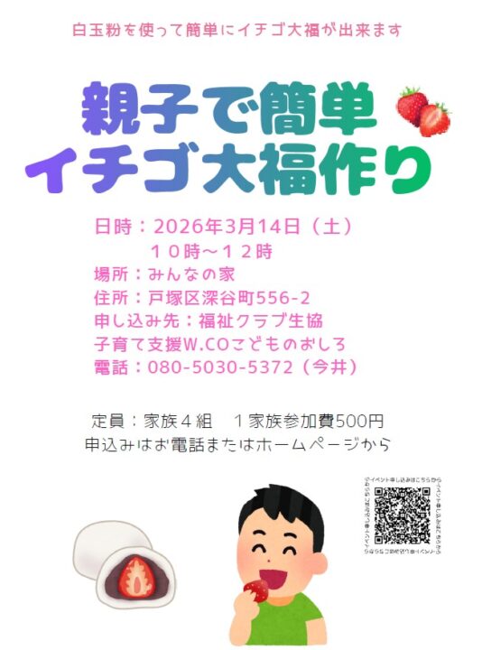 横浜市 戸塚 親子で簡単イチゴ大福作り【2026年3/14】 好評につき3月にも開催します。親子でお菓子作り! はじめてのお菓子作りやお手伝いにも♪家族4組限定なので、お早めにお申し込みください。 1家族 参加費500円 参加予約はこちら 前へ 一覧へ戻る 次へ