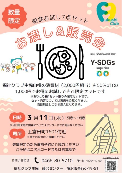 横浜市 戸塚 お渡し&販売会【2026年3/11】 好評につき、数量限定で福祉クラブのお勧めしたい食材をご案内中です! お気軽にお問い合わせください。 お問合せ:0466-80-5710 / 福祉クラブ生協藤沢センター 月~金 9時~17時 ※ 当日のご連絡は必ず、藤沢センターまでお電話お願いします。 参加予約はこちら 前へ 一覧へ戻る 次へ