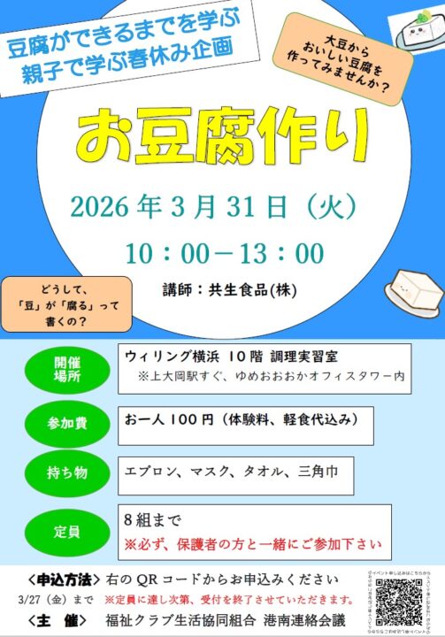 横浜市 港南区 親子で学ぶ春休み企画 お豆腐作り【2026年3/31】 大豆から美味しい豆腐づくり!直接生産者からの話を聞ける機会です。親子で学びながら「美味しい!」も味わえます。 ※定員に達し次第、受付終了となります。お申込頂いた方には順次ご案内します。 お問合せ:0467ー48ー3955 / 福祉クラブ生協 鎌倉センター 月~金 9時~17時 参加予約はこちら 前へ 一覧へ戻る