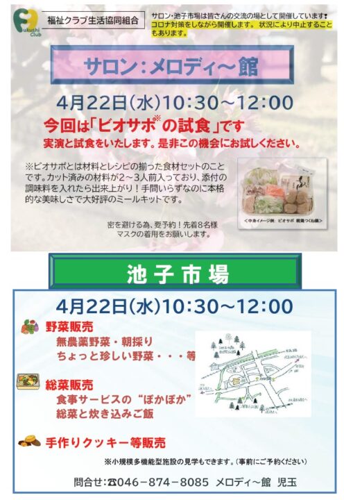 逗子市・葉山町 逗子メロディ~館 サロン・池子市場【2026年4/22】 逗子市池子にある「メロディ~館」では、毎月地域の皆さんの交流の場として、サロン・市場を開催しています。今回は、手間いらずで本格派ミールキットの試食ができます。 お問合せ:046ー874ー8085 / 福祉クラブ生協メロディ~館逗子葉山 月~金 9時~17時 参加予約はこちら 前へ 一覧へ戻る