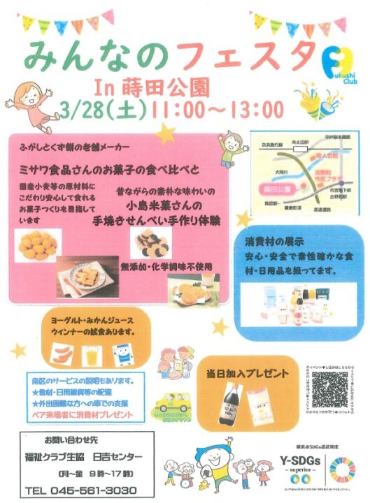 横浜市 南区 みんなのフェスタ【2026年3/28】 福祉クラブのイベントは、生産者に会える! 今回は、2社のお菓子生産者と一緒に開催します。食べ比べや手焼きおせんべい手作り体験、その他生協の試食品などもご用意しています。お気軽にご参加ください。 参加予約はこちら 前へ 一覧へ戻る