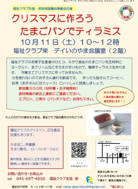 横浜市 栄区 クリスマスに作ろう たまごパンでティラミス【2025年10/11】 火を使わず、子どもと一緒に作れるケーキを一緒につくりましょう。今年のクリスマスは手作りにチャレンジ! お問合せ:045-897-4850 / 福祉クラブ生協栄 月~土 9時~17時 事前申し込みはこちら 前へ 一覧へ戻る 次へ