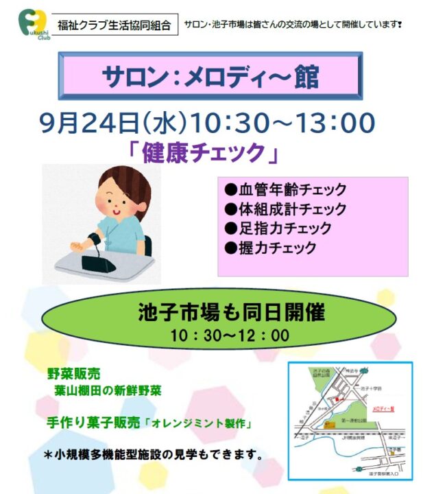 逗子市・葉山町 逗子 サロン「健康チェック」【2025年9/24】 逗子市池子にある「メロディ~館」では、毎月地域の皆さんの交流の場として、サロン・市場を開催しています。自分の状態を知ることが健康の第一歩。お気軽にお越しください。 お問合せ:0467ー48-3955 / 福祉クラブ生協鎌倉センター 月~金 9時~17時 本イベントの参加予約受付は終了いたしました。 前へ 一覧へ戻る 次へ