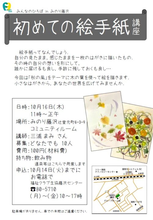 気持ちの良い秋。「絵手紙」を一緒に描いてみませんか。「みのり藤沢」は入居施設・デイサービス・子育て保育室等を含む複合福祉施設です。お気軽に遊びに来てください。