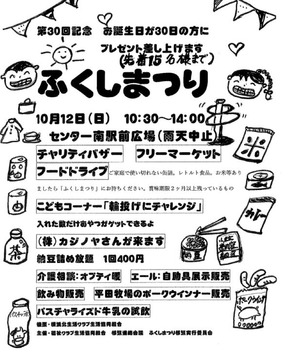 横浜市 都筑ふくしまつり【2025年10/12】 都筑区での「ふくしまつり」は10月12日、センター南駅前広場で開催します。お気軽に遊びに来てください。 お問合せ:044-977-0705 / 福祉クラブ生協初山センター 月~金 9時~17時 参加予約はこちら 前へ 一覧へ戻る 次へ