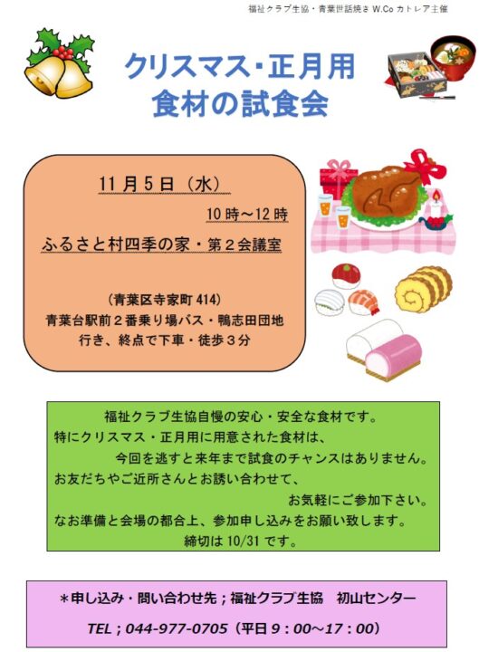 横浜市 青葉区 クリスマス・正月食材の試食会【2025年11/5】 一足早く、クリスマス・お正月におススメしたい食材をお試しできます。まだ組合員でない方も参加できます。生協や宅配サービスを検討されている方もこの機会にお気軽にご参加ください。 参加予約はこちら 前へ 一覧へ戻る 次へ