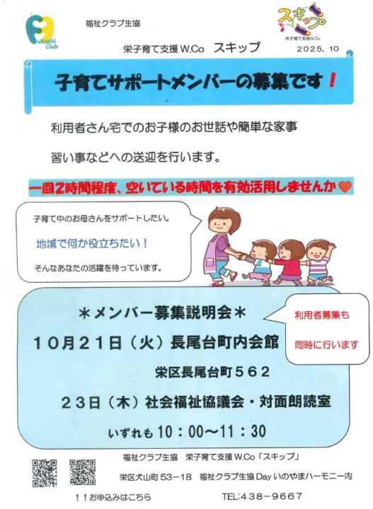横浜市 栄区 子育てサポートメンバー募集【説明会2025年10/21、23】 子育てがひと段落した方、何か新しいことを始めたいと思っている方、地域に役立つ働き方はじめてみませんか 事前申し込みはこちら 前へ 一覧へ戻る 次へ