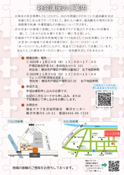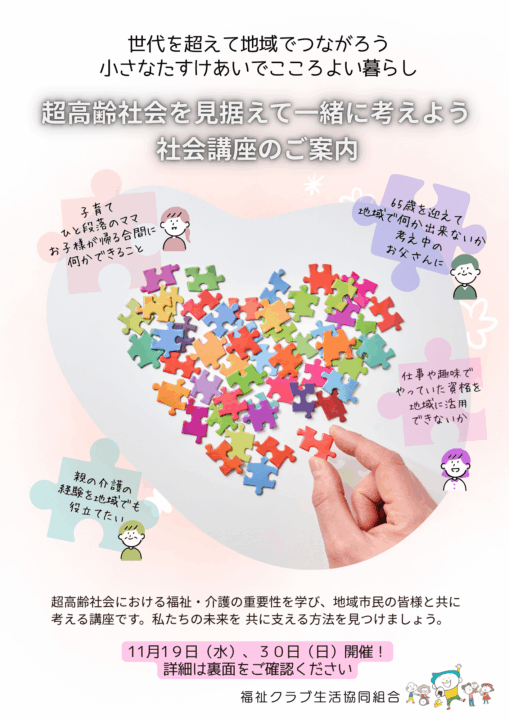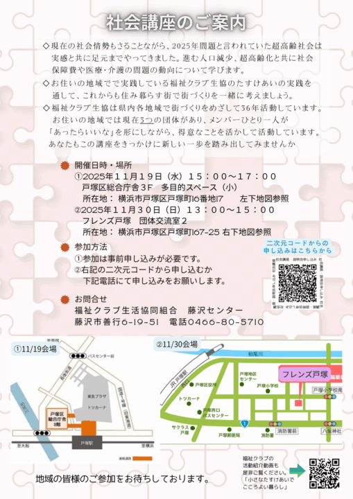 横浜市 戸塚区 超高齢社会を見据えて一緒に考えよう 社会講座【2025年11/19、30】 超高齢社会を見据えて、福祉・介護の重要性を学び、皆さんと一緒に考える講座です。 事前申し込みはこちら 前へ 一覧へ戻る 次へ