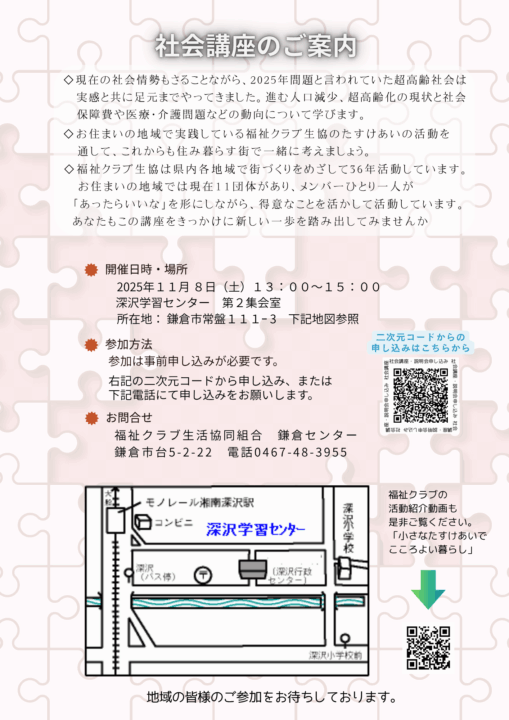 鎌倉市 鎌倉 超高齢社会を見据えて一緒に考えよう 社会講座【2025年11/8】 超高齢社会を見据えて、福祉・介護の重要性を学び、皆さんと一緒に考える講座です。自分でできることから始められます。 事前申し込みはこちら 前へ 一覧へ戻る 次へ