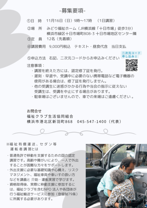 横浜市 資格取得 受講生募集 移動支援サービスをはじめてみませんか【2025年11/16】 外出支援に必要な基礎知識や心構え、リスクマネジメント、福祉車両や車いすの扱い方などを講義と 介助・運転実習で学びます。皆さんはじめて参加の方がほとんどです。 事前申し込みはこちら 前へ 一覧へ戻る 次へ