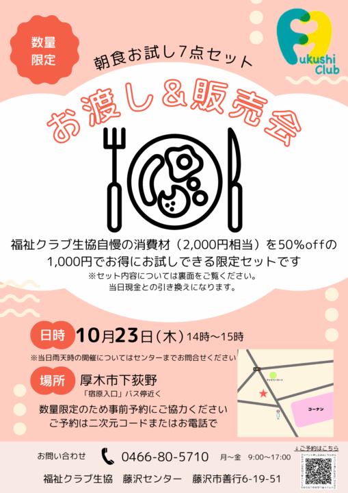厚木市 厚木市 朝食お試し7点セット お渡し&販売会【2025年10/23】 生協や宅配サービスを検討されている方へ 福祉クラブのお勧めしたい食材をお得に利用できる機会です。今回は厚木市2か所の地区限定・数量限定で開催します。会場詳細をお知らせしますので必ず事前申込をお願いします。 参加予約はこちら 前へ 一覧へ戻る 次へ
