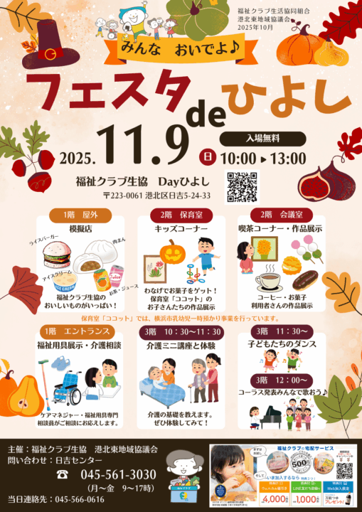 横浜市 港北 フェスタdeひよし 【2025年11/9】 地域のみなさまへの日頃の感謝と福祉クラブのことを知ってもらうために、「Dayひよし」でイベントを開催します。保育室のお子さんからデイサービス利用者の作品展示、おススメしたい食材の模擬店もあります。お気軽にお越しください。 参加予約はこちら 前へ 一覧へ戻る 次へ