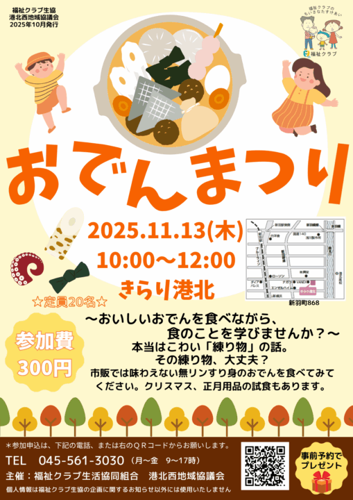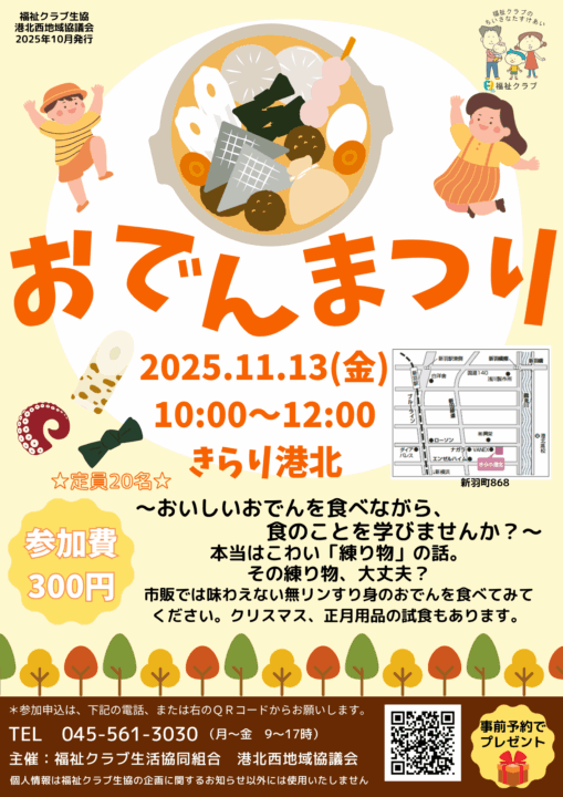 横浜市 港北 おでんまつり【2025年11/13】 おでんを食べながら「食」のことを学びましょう。今や「安心・安全」は当たり前?私たちはどこまで確認できるのでしょうか。 参加費300円・ 定員20名で開催します。 お早めにお申込ください。 事前申し込みはこちら 前へ 一覧へ戻る 次へ