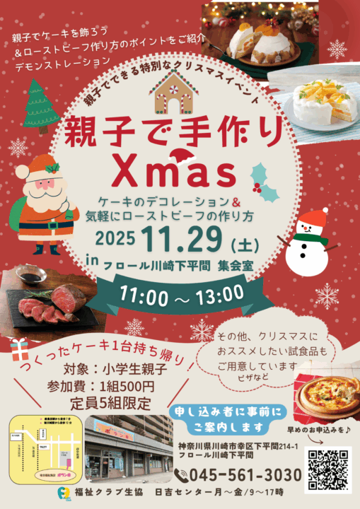 川崎市 幸区 親子で手作りXmas【2025年11/29】 今年のクリスマスは、オリジナルデコレーションケーキを親子で楽しみませんか。&ちょっと知っておくと重宝するローストビーフの作り方をご紹介します。 事前申し込みはこちら 前へ 一覧へ戻る