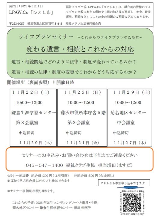ライフプランセミナー 変わる遺言・相続とこれからの対応【2025年11/22、23、29】