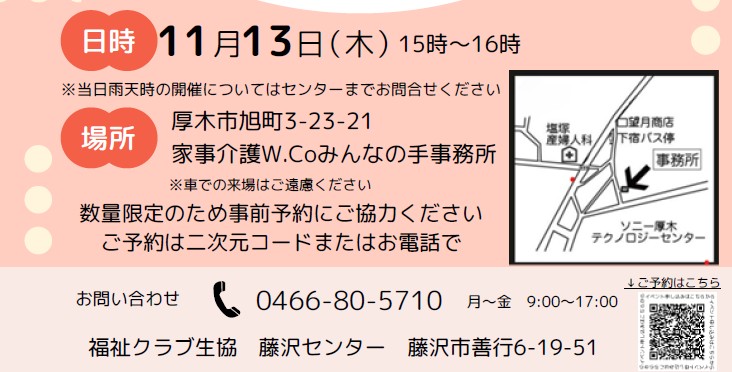 厚木市 厚木 朝食お試し7点セット お渡し&販売会【2025年11/13】 福祉クラブのお勧めしたい食材をお得にお試ししてみませんか。厚木市内エリア限定・数量限定で開催します。会場詳細をお知らせしますので必ず事前申込をお願いします。 ※ 当日のお申込みは、必ず藤沢センターまでお電話お願いします 本イベントの参加予約受付は終了いたしました。 前へ 一覧へ戻る 次へ