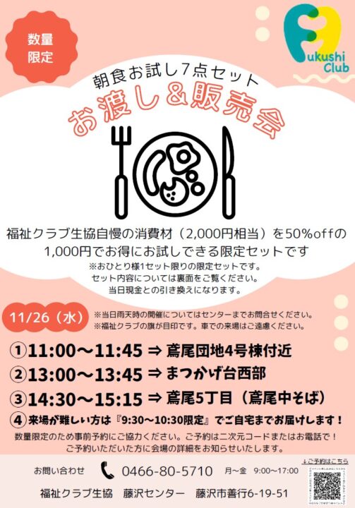 厚木市 厚木 朝食お試し7点セット お渡し&販売会【2025年11/26】 厚木市内エリア限定・数量限定で、福祉クラブのお勧めしたい食材をご案内中です! 会場詳細をお知らせしますので必ず事前申込をお願いします。 ※ 当日のご連絡は、必ず藤沢センターまでお電話お願いします 参加予約はこちら 前へ 一覧へ戻る 次へ