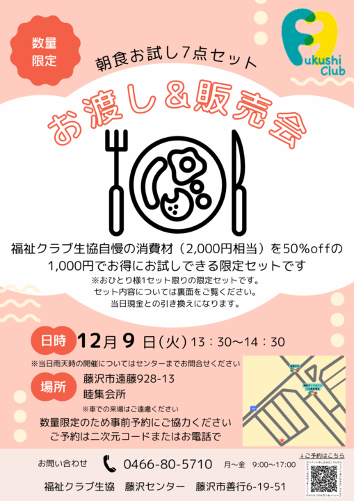 藤沢市 藤沢 朝食お試し7点セット お渡し&販売会【2025年12/9】 数量限定・エリア限定で、福祉クラブのお勧め食材をお試しできる機会です。 宅配サービスや生協を検討されている方にも、ぜひご紹介ください。 ※ 当日のご連絡は、必ず藤沢センターまでお電話お願いします お問合せ:0466ー80ー5710 / 福祉クラブ生協藤沢センター 月~金 9時~17時 参加予約はこちら 前へ 一覧へ戻る 次へ