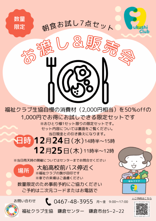 鎌倉市 鎌倉 朝食お試し7点セット お渡し&販売会【2025年12/24、25】 好評につき、数量限定で福祉クラブのお勧めしたい食材をご案内中です! まずはお試しからお気軽にお問い合わせください。 ※ 当日のご連絡は、必ず鎌倉センターまでお電話お願いします お問合せ:0467ー48ー3955 / 福祉クラブ生協 鎌倉センター 月~金 9時~17時 参加予約はこちら 前へ 一覧へ戻る 次へ