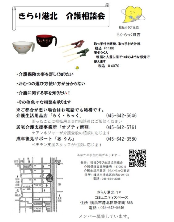 場所:福祉クラブ生協 きらり港北 (市営地下鉄グリーンライン 新羽駅・北新横浜駅 徒歩7~8分)