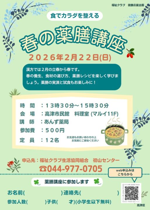 川崎市 高津 食でカラダを整える 春の薬膳講座【2026年2/22】 食でカラダを整える 健康応援企画を開催します。「あんず薬局」さんをお招きして、薬膳の実演と試食も楽しみながら 食材の選び方や春の養生を学びましょう。 日時:2月22日(日) 13:30~15:30 場所:高津市民館 料理室 (マルイ11階) 参加費:500円 お問合せ:044ー977ー0705 / 福祉クラブ生協 初山センター 月~金 9時~17時 参加予約はこちら 前へ 一覧へ戻る 次へ
