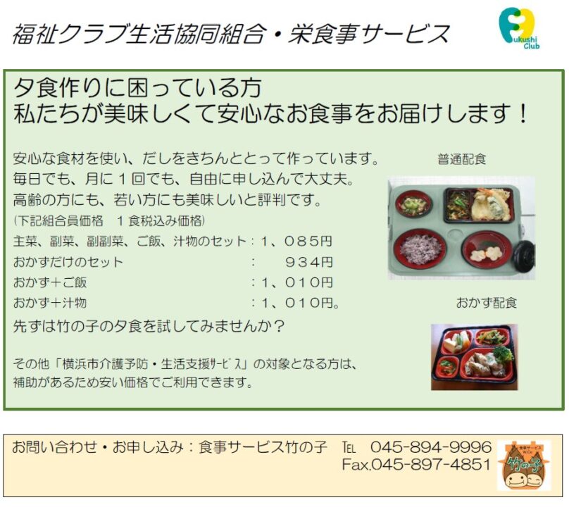 横浜市 栄 食事サービス 世代問わずお試しできます 福祉クラブの安心な食材を使い、出汁をきちんととって作っています。 毎日でも、月に1 回でも、自由に申し込み可能。高齢の方、子育て世代の方もお気軽に、まずはお試ししませんか。 参加予約はこちら 前へ 一覧へ戻る