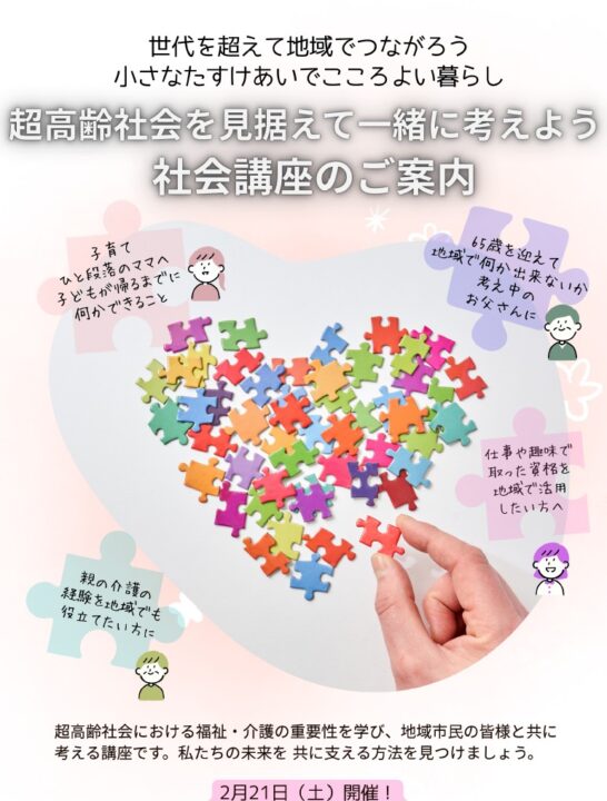 「2025年問題」今後も進む人口減少、超高齢化の現状、そして社会保障費や医療・介護問題などの動向を改めて学び、地域の皆さんと一緒にこれからを考える講座です。お住まいの地域で活動できるたすけあい・地域貢献への第一歩に。