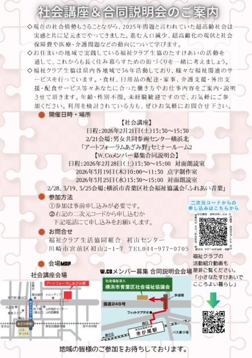 お問合せ:044ー977ー0705 / 福祉クラブ生協初山センター 月~金 9時~17時