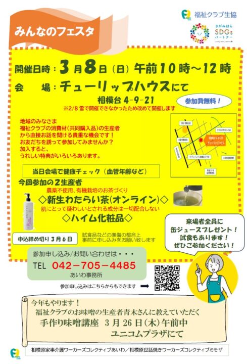 相模原市 相模原 みんなのフェスタ 新生わたらい茶・ハイム化粧品【2026年3/8】 生産者から直接話が聞ける機会「みんなのフェスタ」。日常的に飲むお茶、使用する化粧品。よく利用するものだからこそ、どんなものか「知って選ぶ」をはじめませんか。 お問合せ:042ー705ー4485 / 福祉クラブ生協あいわ事務所 月~金 9時~17時 本イベントの参加予約受付は終了いたしました。 前へ 一覧へ戻る 次へ
