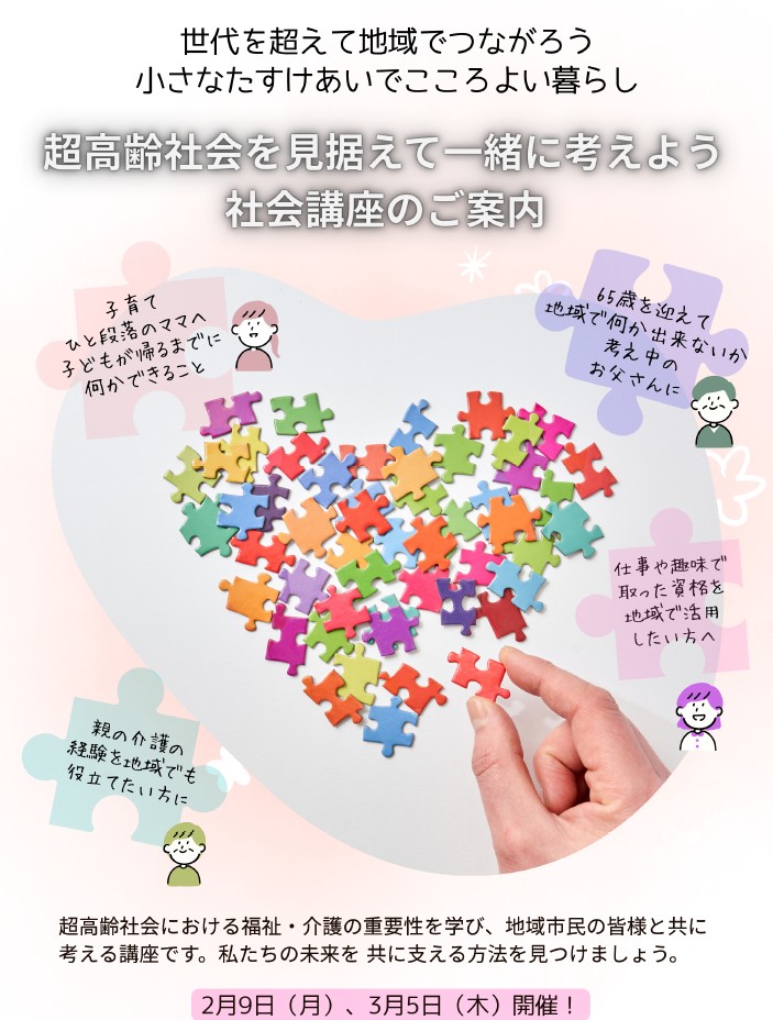 「2025年問題」今後も進む人口減少、超高齢化の現状、そして社会保障費や医療・介護問題などの動向を改めて学び、地域の皆さんと一緒にこれからを考える講座です。お住まいの地域で活動できるたすけあい・地域貢献への第一歩に。