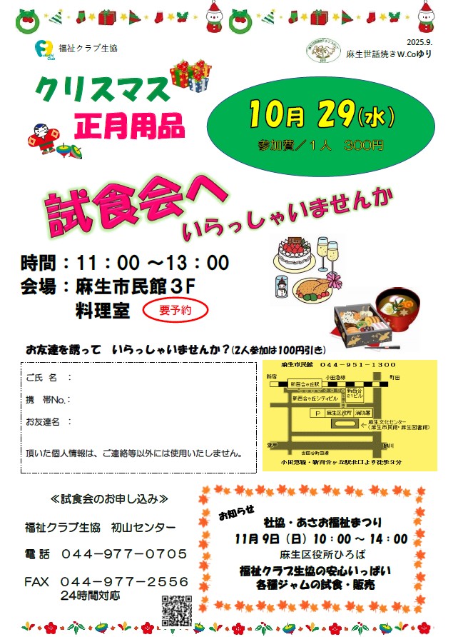 クリスマス・お正月のおススメ食材を、いち早く試食ができます。お友だちとご一緒の参加もお待ちしています。